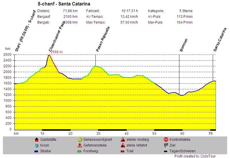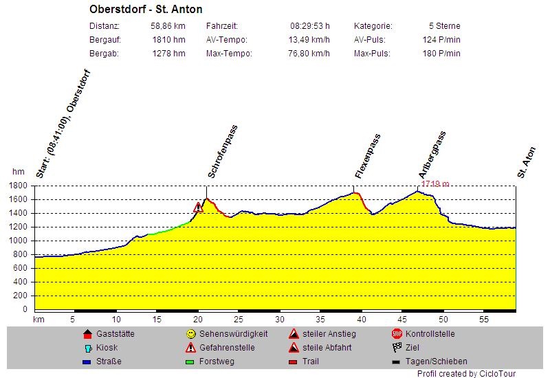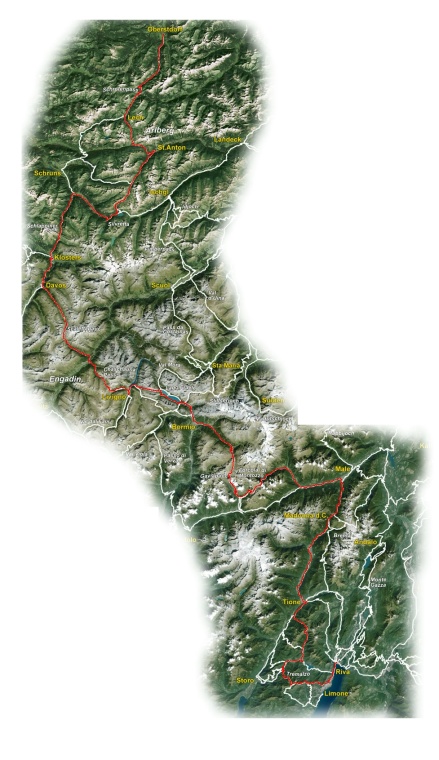 Kilometer gesamt: 401 km Höhenmeter gesamt: 12.220 Hm Beste Reisezeit: August - September Startpunkt: Oberstdorf im Allgäu Anfahrt: München - Autobahn Lindau - nach Oberstdorf. Von München ca. 2 Stunden. Kartografie: Kompass Karten 1:50000 Nr. 113, 102, 96, 52, 42, 41, 33 und 3 I Etappe: Oberstdorf - Schrofenpass - Warth - Lech - Zürs - St. Anton 59 Km 1810 Hm Höhenprofil II Etappe: St. Anton - Heilbronner Hütte - Partenen - Gargellen - Schlappiner Joch - Klosters 61 Km 2257 Hm Höhenprofil III Etappe: Klosters - Davos - Dürrboden - Scalettapass - S-chanf 47 Km 1688 Hm Höhenprofil IV Etappe: S-chanf - Chaschauna Pass - Livignio - Passo Alpisella - Bormeo - Santa Catarina 72 Km 2160 Hm Höhenprofil V Etappe: Santa Catarina - Gavia Pass - Pezzo - Forcellina di Montozzo - Dimaro 71 Km 1890 Hm Höhenprofil VI Etappe: Dimaro - Madonne di Campiglio - Pinzolo - Zucclo - Bocca del Ussol - Ledro See - Riva 93 Km 2415 Hm Höhenprofil Gesamt: 401 Km 12.220 Hm Hinweis Wetterbericht genau studieren! Die Passage über Schrofenpass erfordert Trittsicherheit, alpine Erfahrung und sichere Wetterverhältnisse. Alle Abfahrten auf Pfade sind technisch anspruchsvoll und nicht geeignet für Anfänger. zur Strecke zur Bildergallerie | ||||||||||||||||||||||||||||||||||||||||||||||||||||||||||||||||