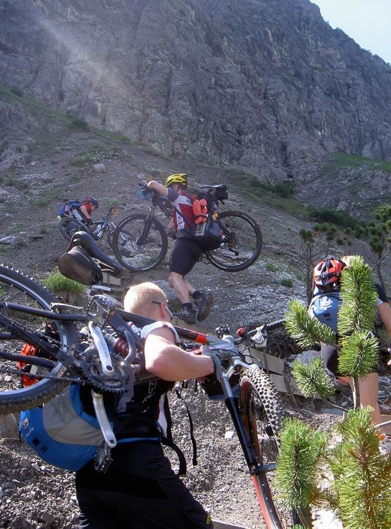 I Etappe Die Anfahrt zum Schrofenpass erwies sich Anfangs als etwas schwierig, da wir von Oberstdorf keine Kompass Karte hatten und auf unsere Erinnerung vertrauen mussten. Den gleichen Weg hatten wir 2000 bei unserer damaligen Alpenüberquerung genommen. Am Schrofenpass angekommen mussten wir feststellen, daß wir nicht die einzigen Alpenüberquerer an diesem Tag waren. Aus allen Bundesländern Deutschlands standen gröhlende Bikerhorden vor dem Pass. | ||||||||||||||||||||||||||||||||||||||||||||||||||||||||||||||||