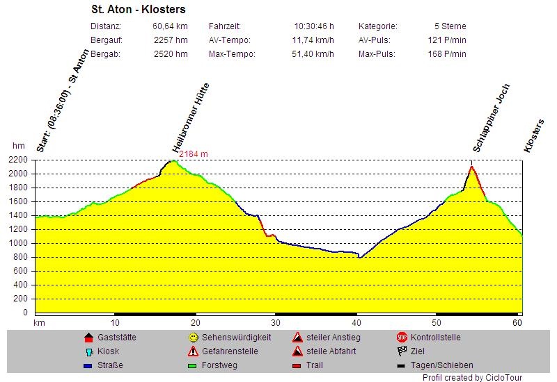 Kilometer gesamt: 401 km Höhenmeter gesamt: 12.220 Hm Beste Reisezeit: August - September Startpunkt: Oberstdorf im Allgäu Anfahrt: München - Autobahn Lindau - nach Oberstdorf. Von München ca. 2 Stunden. Kartografie: Kompass Karten 1:50000 Nr. 113, 102, 96, 52, 42, 41, 33 und 3 I Etappe: Oberstdorf - Schrofenpass - Warth - Lech - Zürs - St. Anton 59 Km 1810 Hm Höhenprofil II Etappe: St. Anton - Heilbronner Hütte - Partenen - Gargellen - Schlappiner Joch - Klosters 61 Km 2257 Hm Höhenprofil III Etappe: Klosters - Davos - Dürrboden - Scalettapass - S-chanf 47 Km 1688 Hm Höhenprofil IV Etappe: S-chanf - Chaschauna Pass - Livignio - Passo Alpisella - Bormeo - Santa Catarina 72 Km 2160 Hm Höhenprofil V Etappe: Santa Catarina - Gavia Pass - Pezzo - Forcellina di Montozzo - Dimaro 71 Km 1890 Hm Höhenprofil VI Etappe: Dimaro - Madonne di Campiglio - Pinzolo - Zucclo - Bocca del Ussol - Ledro See - Riva 93 Km 2415 Hm Höhenprofil Gesamt: 401 Km 12.220 Hm Hinweis Wetterbericht genau studieren! Die Passage über Schrofenpass erfordert Trittsicherheit, alpine Erfahrung und sichere Wetterverhältnisse. Alle Abfahrten auf Pfade sind technisch anspruchsvoll und nicht geeignet für Anfänger. zur Strecke zur Bildergallerie | ||||||||||||||||||||||||||||||||||||||||||||||||||||||||||||||||