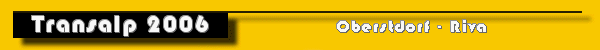 "Lass uns mal eine neue Tour fahren" sagte ich zu Peter "etwas was wir selber zusammenstellen können". Gesagt getan! Mit der Software "Traumtouren Transalp" stellten wir eine eigene anspruchsvolle Tour zusammen. In 6 Tagen sollte es von Oberstdorf über Österreich und Schweiz nach Italien zum Gardasee gehen. Und das ist dabei herausgekommen: Transalp 2006 - in 6 Tagen von Oberstdorf nach Riva. Während der Anfahrt nach Oberstdorf regnet und hagelte es was die Wolken hergaben. Max 40 km/h auf der Autobahn und ein Temperatursturz von 32 auf 20 Grad. Aber: unsere Transalp-Regel besagt, dass wenn es am Vorabend regnet, der nächste Tag wunderbar sonnig und warm wird. Und.......es stimmte! |