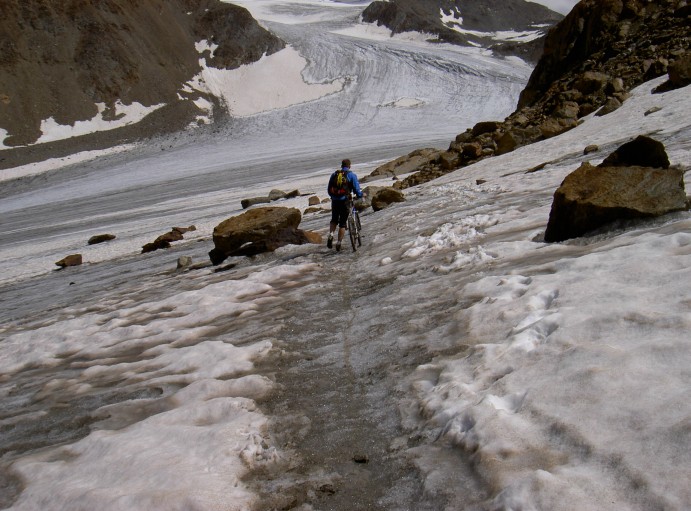 Wir wissen wie schnell das Wetter in diesen Höhen umschlagen kann und beeilen uns um ans Ziel in 3020 Metern Höhe zu kommen. Die Kulisse wird immer beeindruckender, die Zunge des Gletschers scheint uns entgegenzukommen. An Fahren ist hier nicht mehr zu denken - es wird geschoben und getragen - den Puls immer bei 165 Sachen. Ab und zu kommen uns Bergwanderer entgegen, die uns kopfschüttelnd nach dem Sinn der Aktion fragen. Eine wirklich einleuchtende Erklärung kann jedoch keiner von uns geben. |