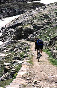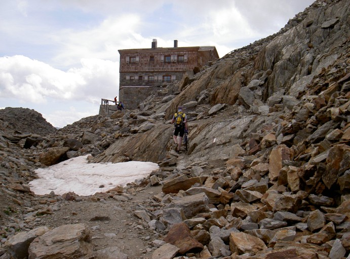 Wir schieben unsere Bikes im Schnee, während die Sonne unbarmeherzig auf uns niederbrennt - 23 Grad auf 2700 Metern hat man nicht alle Tage. Ich bereue bereits seit ca. 300 Höhenmeter, dass ich meinen Sunblocker gegen einen Sunstick ausgetauscht habe. Die letzten Höhenmeter werden bei 40 % Steigung zurückgelegt - 2 Schritte nach vorne und gleich wieder einen zurück. Zu steil um schnell mit einem 8,5 Kilo Rucksack und einem Bike auf den Schultern voranzukommen. Schliesslich schaffen wir es uns in die Riege der stolzen Wanderer einzureihen, die es auf 3017m geschafft haben. Und wir sind uns sicher: viele sind neidisch dass wir es bis hierher mit den Bikes geschafft haben. Nach einer kurzen Rast gehts wirklich bergab. Leider die ersten 250 Höhenmeter nur tragend und schiebend, aber dann beginnt ein mit Felsen übersähter Trail der unsere Bikes und unsere Konzentration zu 100 Prozent fordert. Nach einer Reifenpanne von Dirk (schon wieder an der gleichen Stelle wie 2001) führt der Pfad in einen Tannenwald. Der Boden wird sanfter und wir genießen die letzen Höhenmeter zum Stausee. Damit klingt der erste Tag unseres Abenteuers aus, bevor wir unser Nachtquartier in Karthaus finden. Am zweiten Tag steht die Auffahrt zum Eisjöchl (2875m) auf dem Programm. Fast 1700 Meter am Stück, davon ca. 1000 auf einem uralten Karrenweg. Und Dank wunschwetter.de ist das Wetter heute wieder schön. Die Auffahrt bis zum Eishof auf über 2100 Meter gestaltet sich fast wie eine Fahrt durch die Münchner Fussgängerzone. Obwohl keine Ferienzeit oder Wochenend ist, scheint heute Norddeutschland geschlossen einen Wanderausflug zu machen. <<<< weiter >>>> | |||||||||||||||||||||||||||||||||||||||||||||||||||||||||||||||||