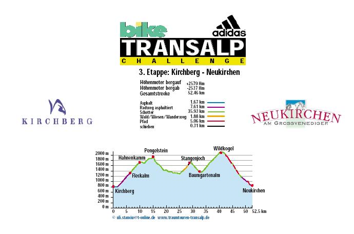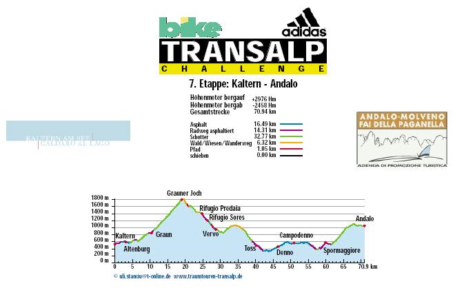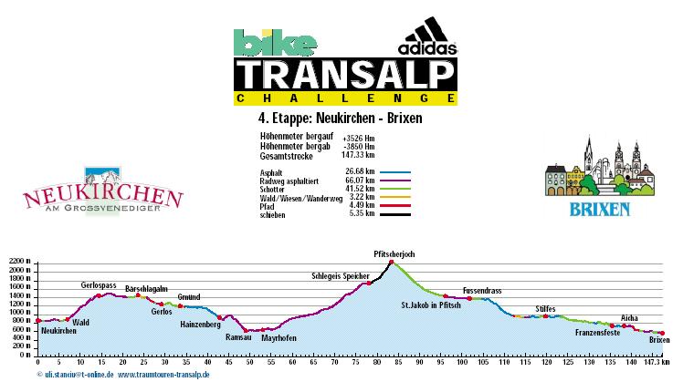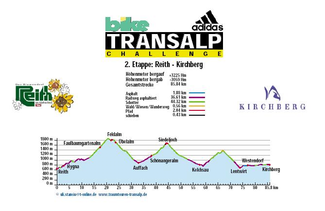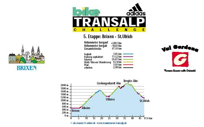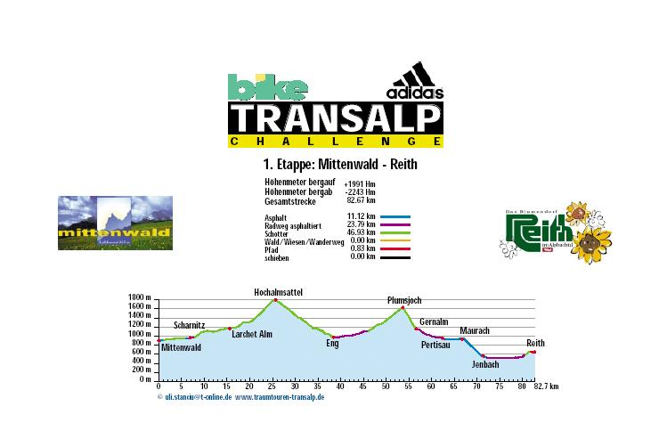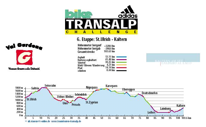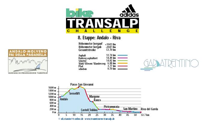 1. Etappe - Mittenwald nach Reith - 82 km und 1.991 Höhenmeter 2. Etappe - Reith nach Kirchberg - 85 km und 3.225 Höhenmeter 3. Etappe - Kirchberg nach Neukirchen - 51 km und 2.547 Höhenmeter 4. Etappe - Neukirchen nach Brixen - 147 km und 3.526 Höhenmeter 5. Etappe - Brixen nach St. Ulrich - 47 km und 2.793 Höhenmeter 6. Etappe - St. Ulrich nach Gröden - 103 km und 3.288 Höhenmeter 7. Etappe - Gröden nach Andalo - 71 km und 2.976 Höhenmeter 8. Etappe - Andalo nach Riva - 53,7 hm und 1.042 Höhenmeter |